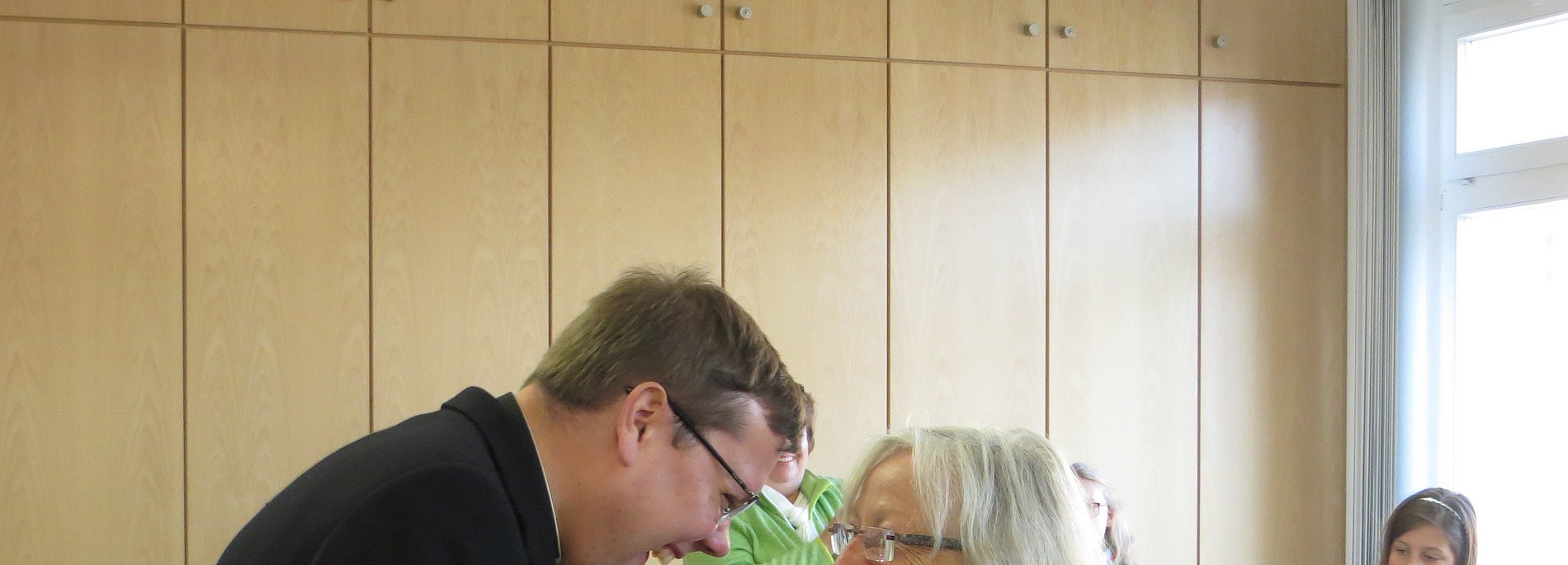 Pfarrer Marc Stenger ehrte bei der Buchausstellung Frau Inge Luy für 15 Jahre ehrenamtliche Tätigkeit in der Bücherei.