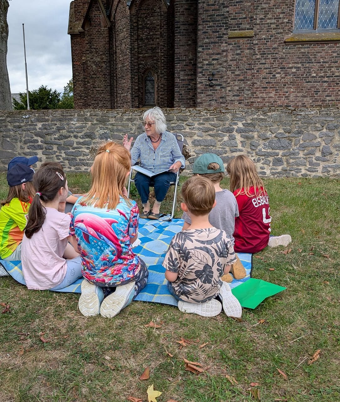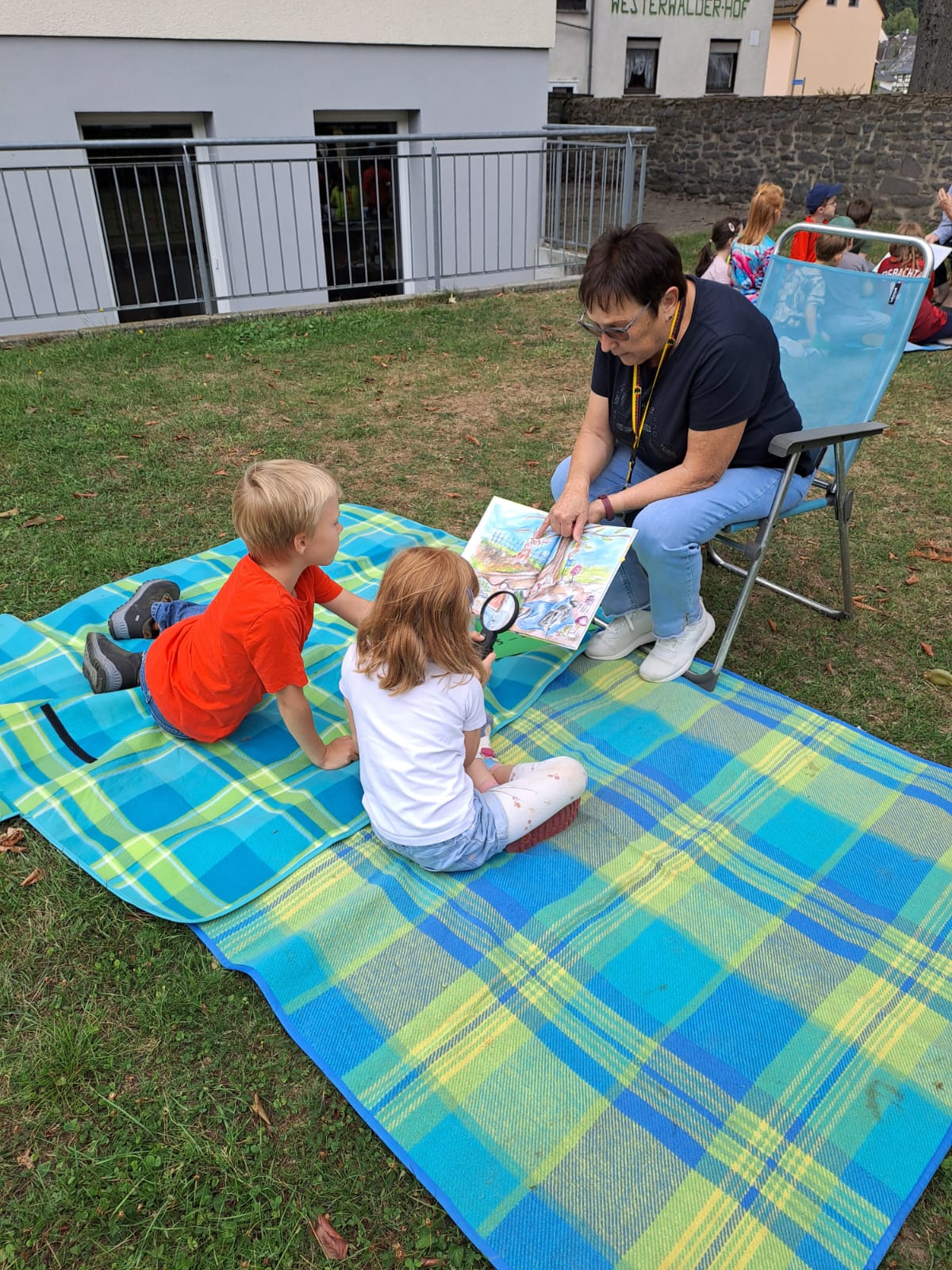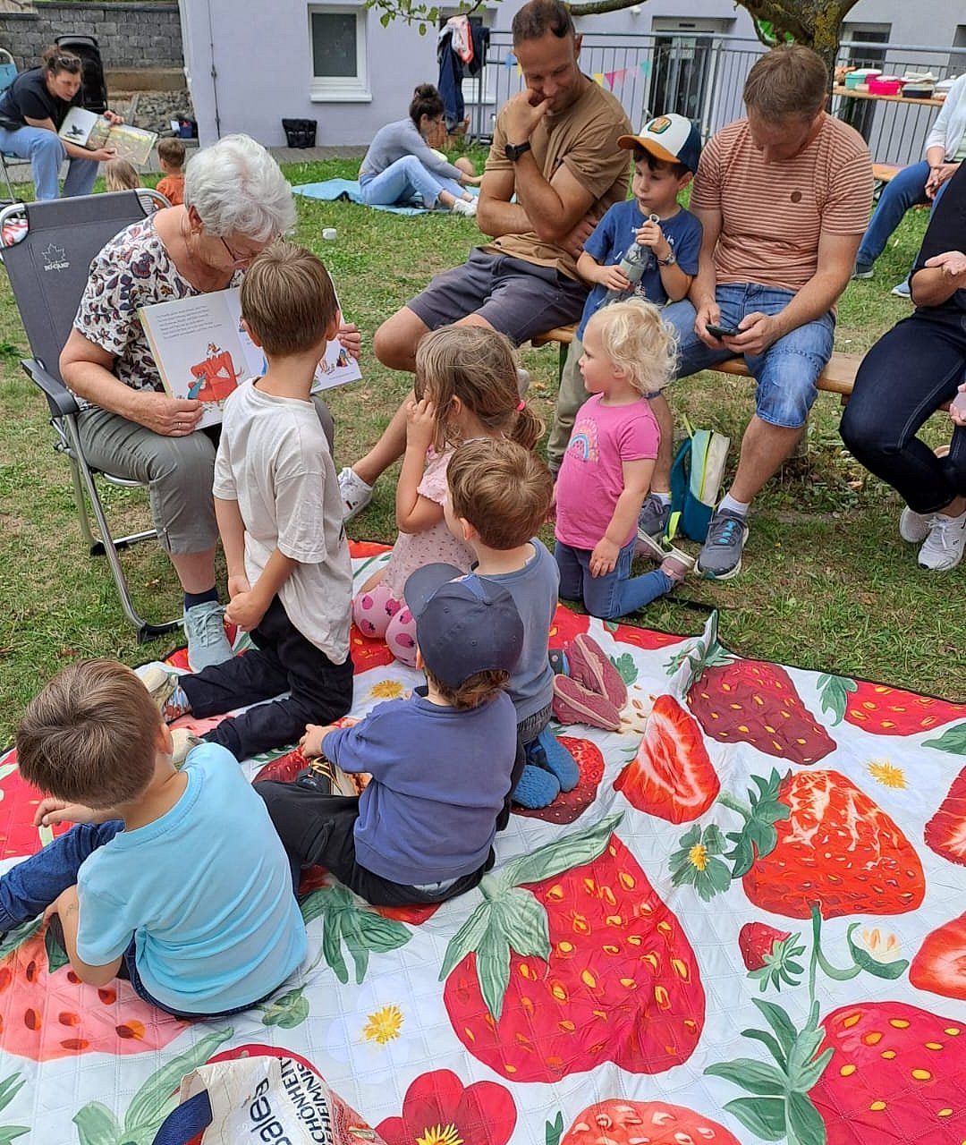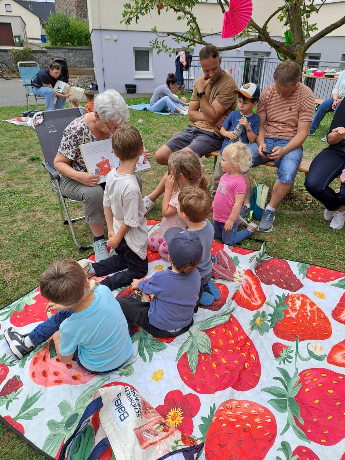 öffentliche Bücherei Nentershausen ein Vorlesepicknick im Pfarrgarten. Viele Eltern